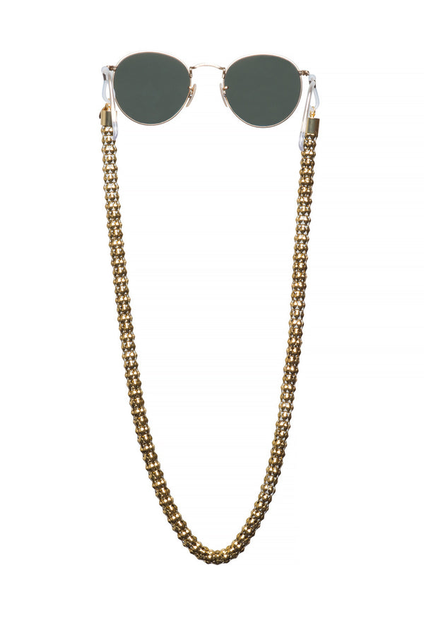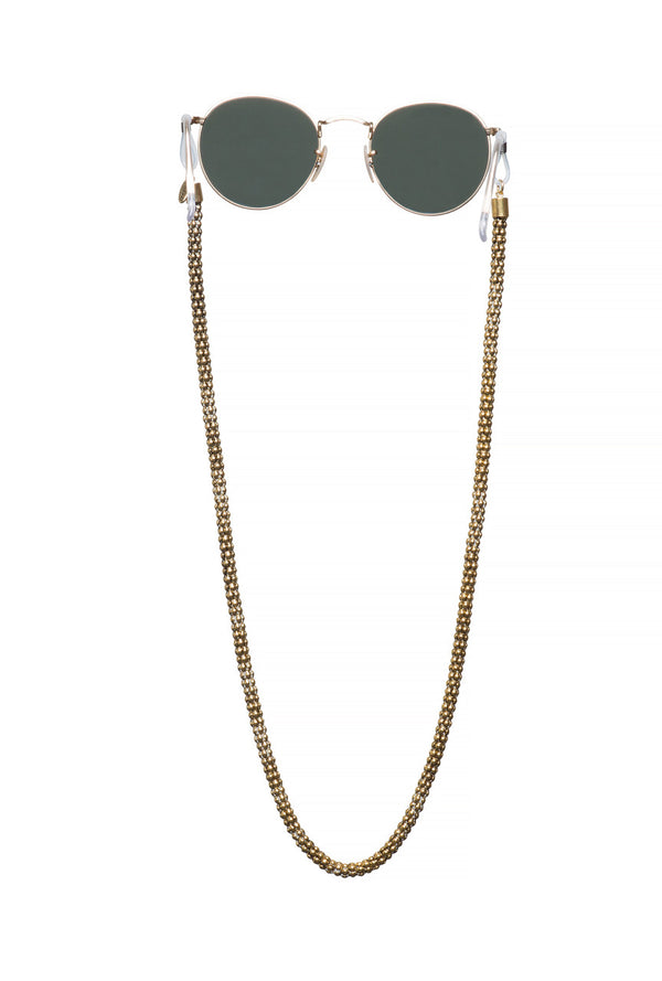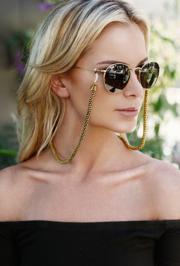 Medium Size Strap 23" (8 cm) Available in a bronze, vintage Gold. Two strap widths: (skinny 6 mm) or (wide 1 cm) Chain is hollow, making it light-weight and easy-to-wear. Customize attachment piece color to black or clear to match any style eyewear....