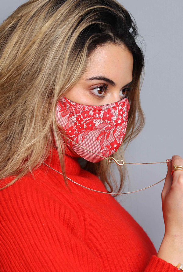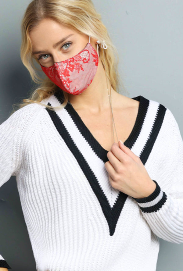 Three layers of lightweight 100% cotton (with a middle anti-bacterial layer) Adjustable nose bridge & adjustable ear loops, one size fits all. Colors available: Black, Red, White Pair with our Sintillia Mask Chains that also can be used as sunglass chains....